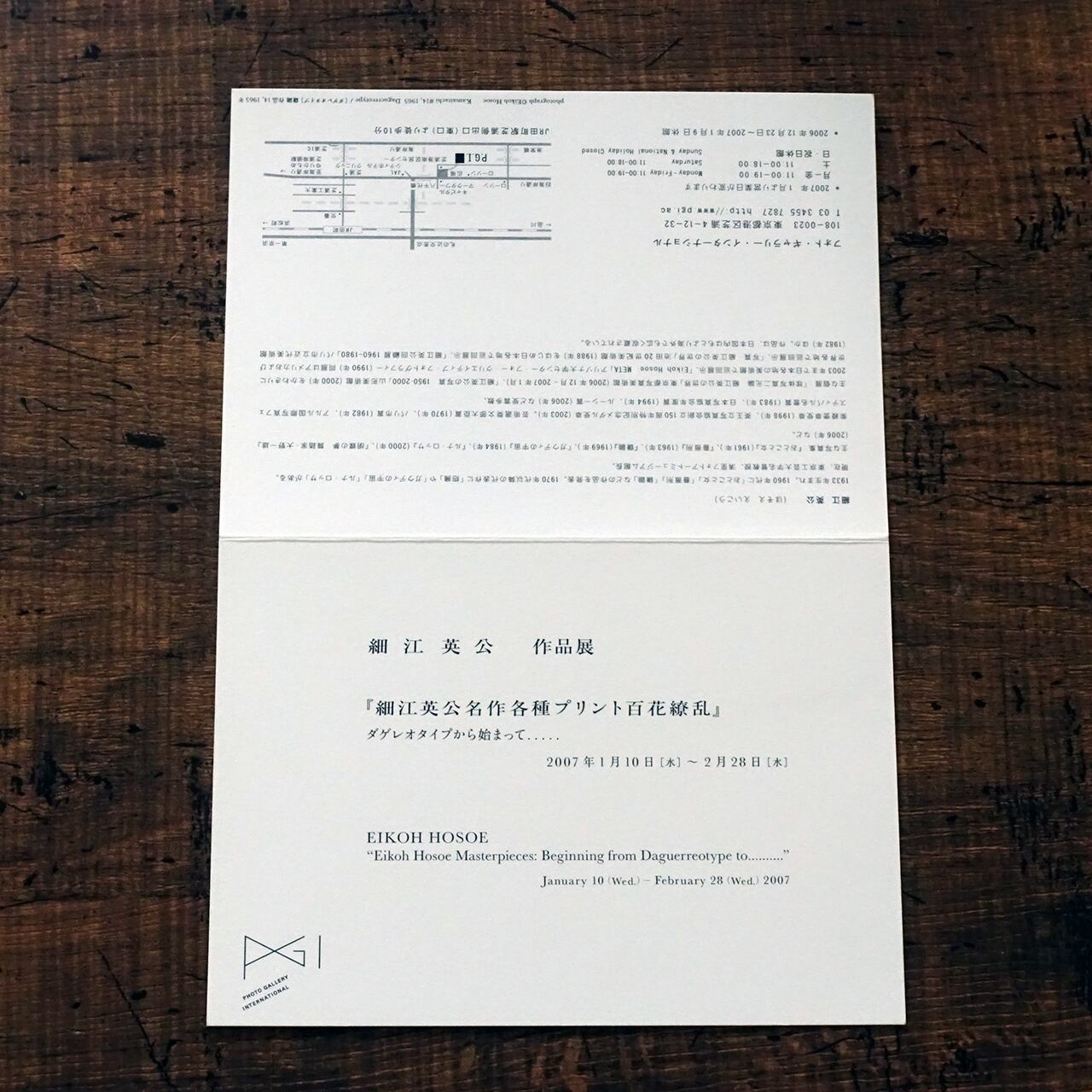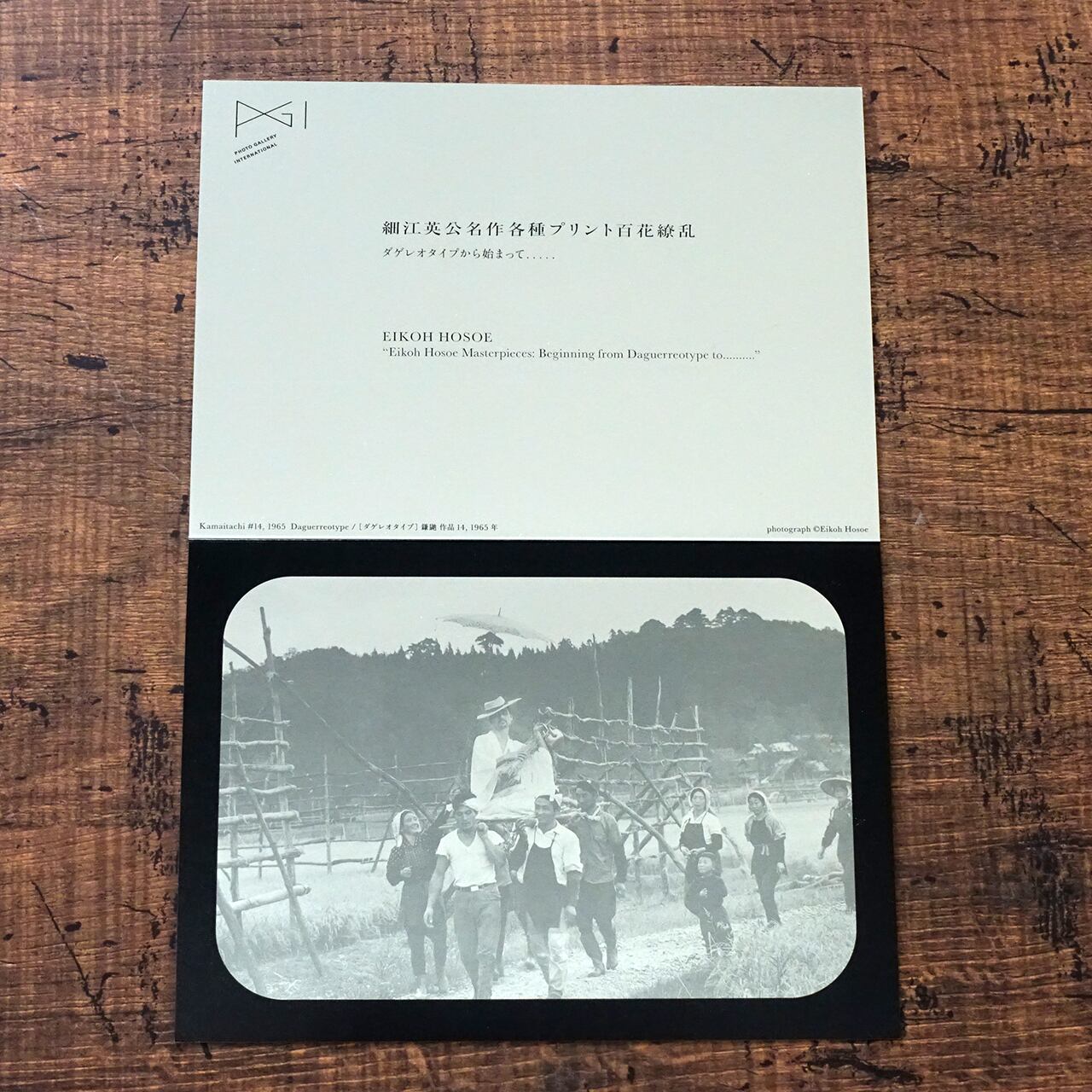 2007年にフォト・ギャラリー・インターナショナルで開催された細江英公作品展の告知用カード。土方巽を撮影した代表作「鎌鼬」のワンショットがシルバーペーパーの上に印刷されている。