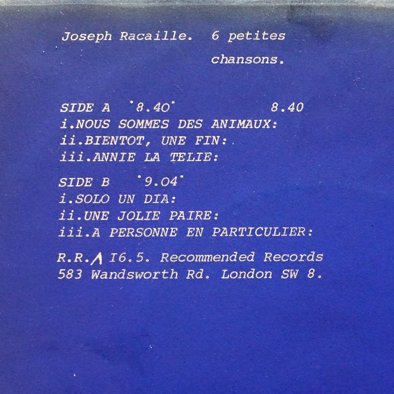 ZNRのJoseph Racailleが1983年に発表した33回転7nch限定ミニアルバム。