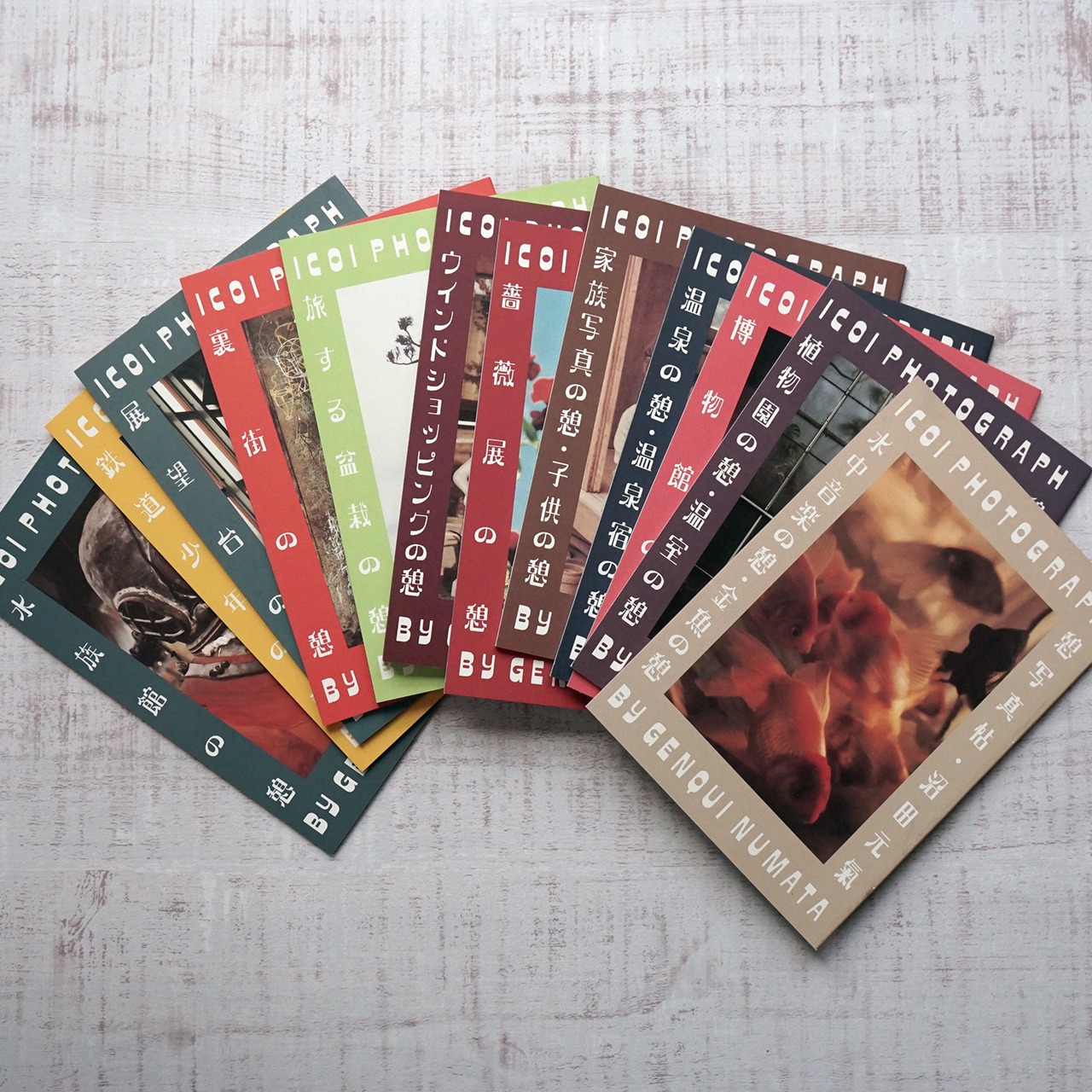 「水族館の憩」「裏街の憩」「水中音楽の憩」「鉄道少年の憩」「温泉の憩」「階段の憩」「植物園の憩」「博物館の憩」「家族写真の憩」「薔薇展の憩」「旅する盆栽の憩」「ウインドウショッピングの憩」の全12冊の構成。